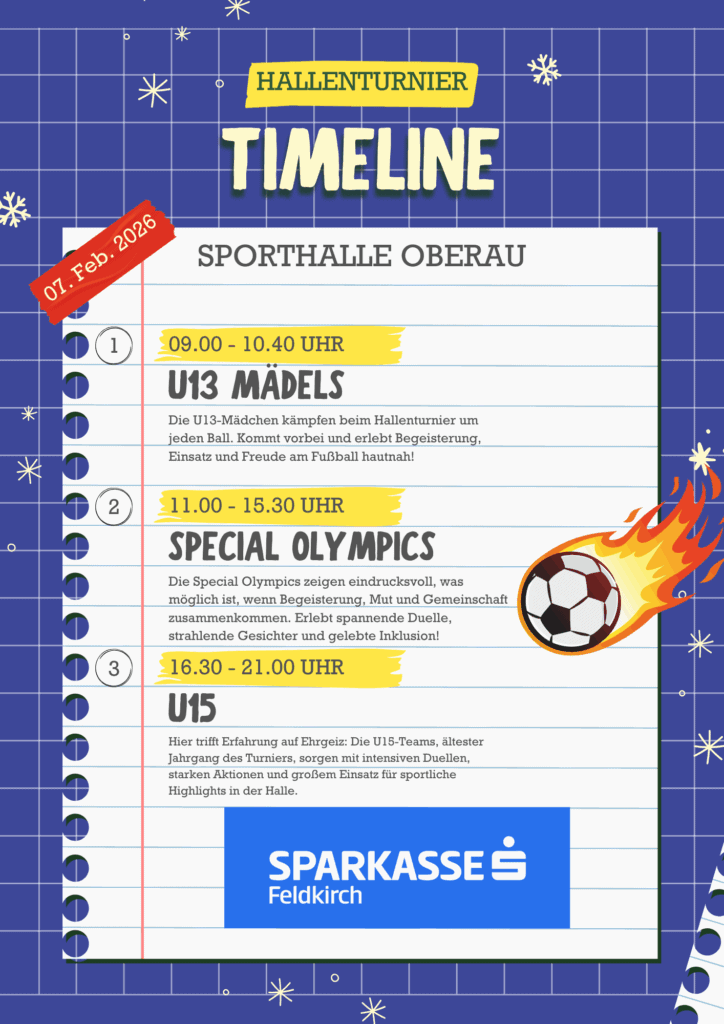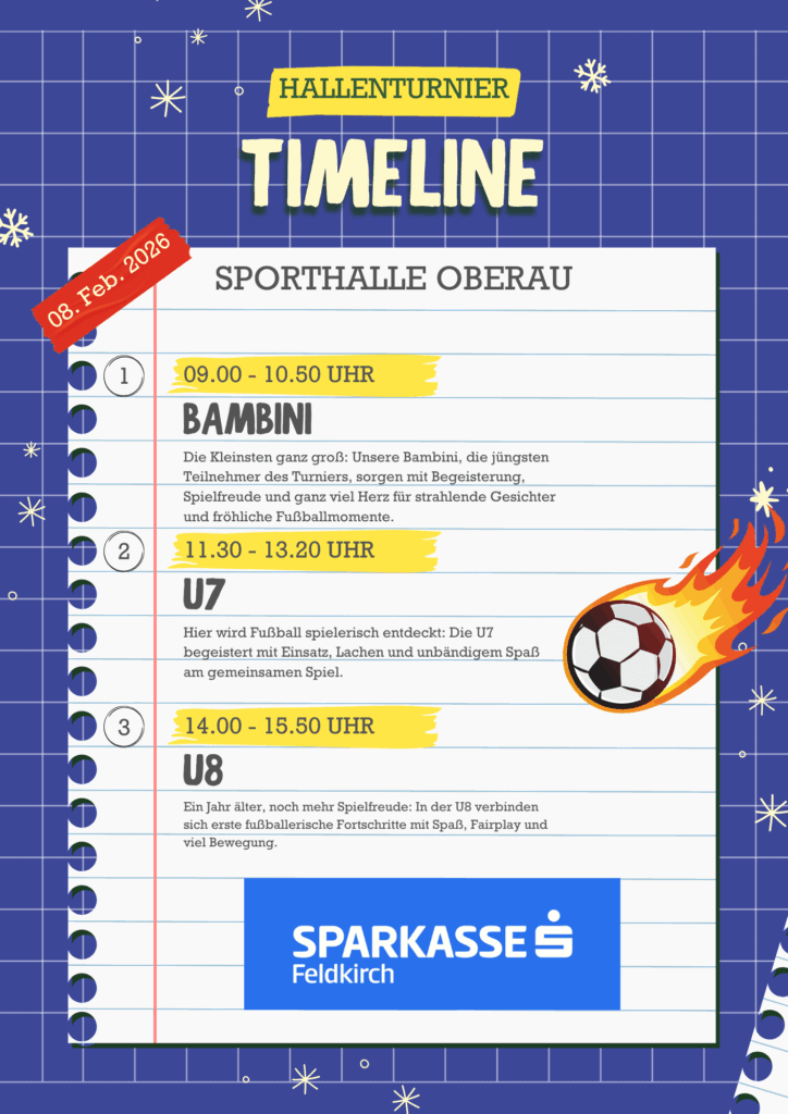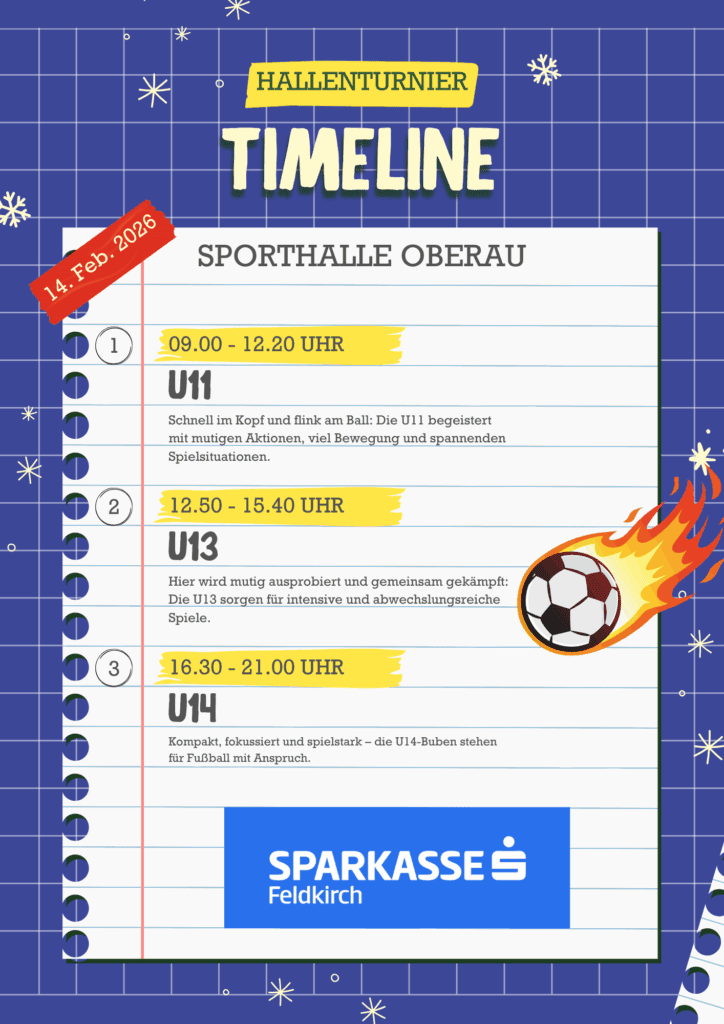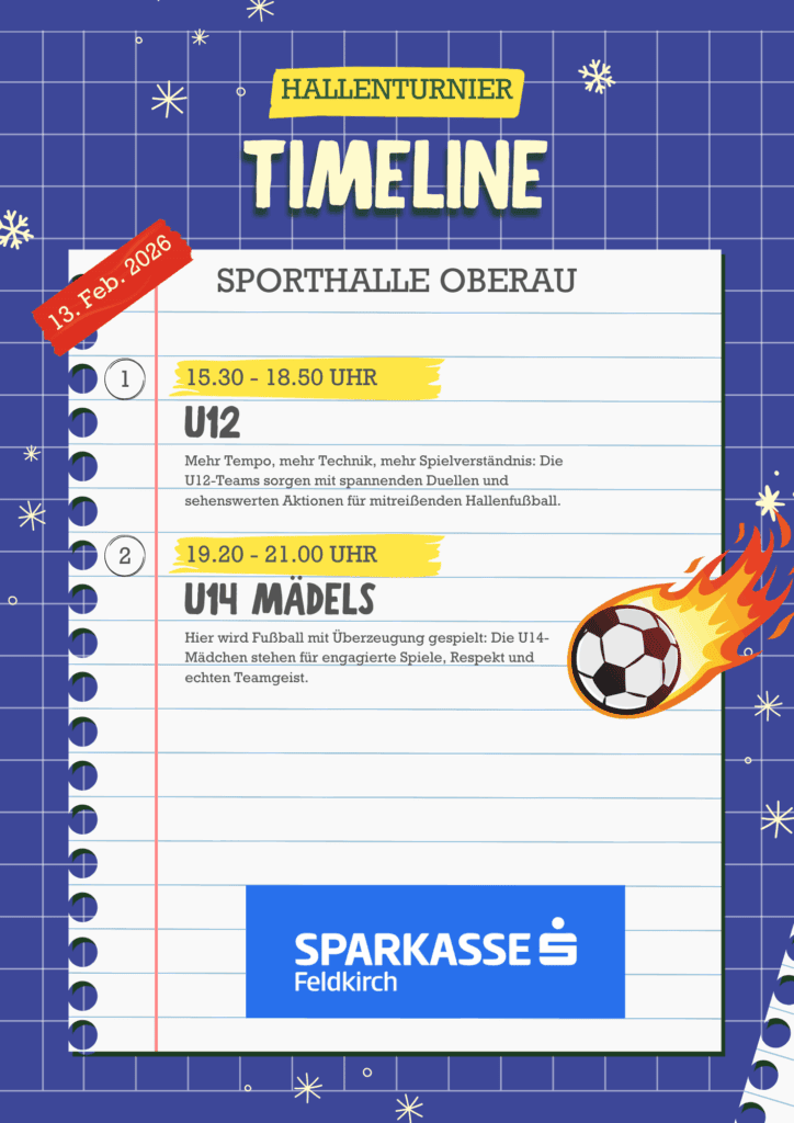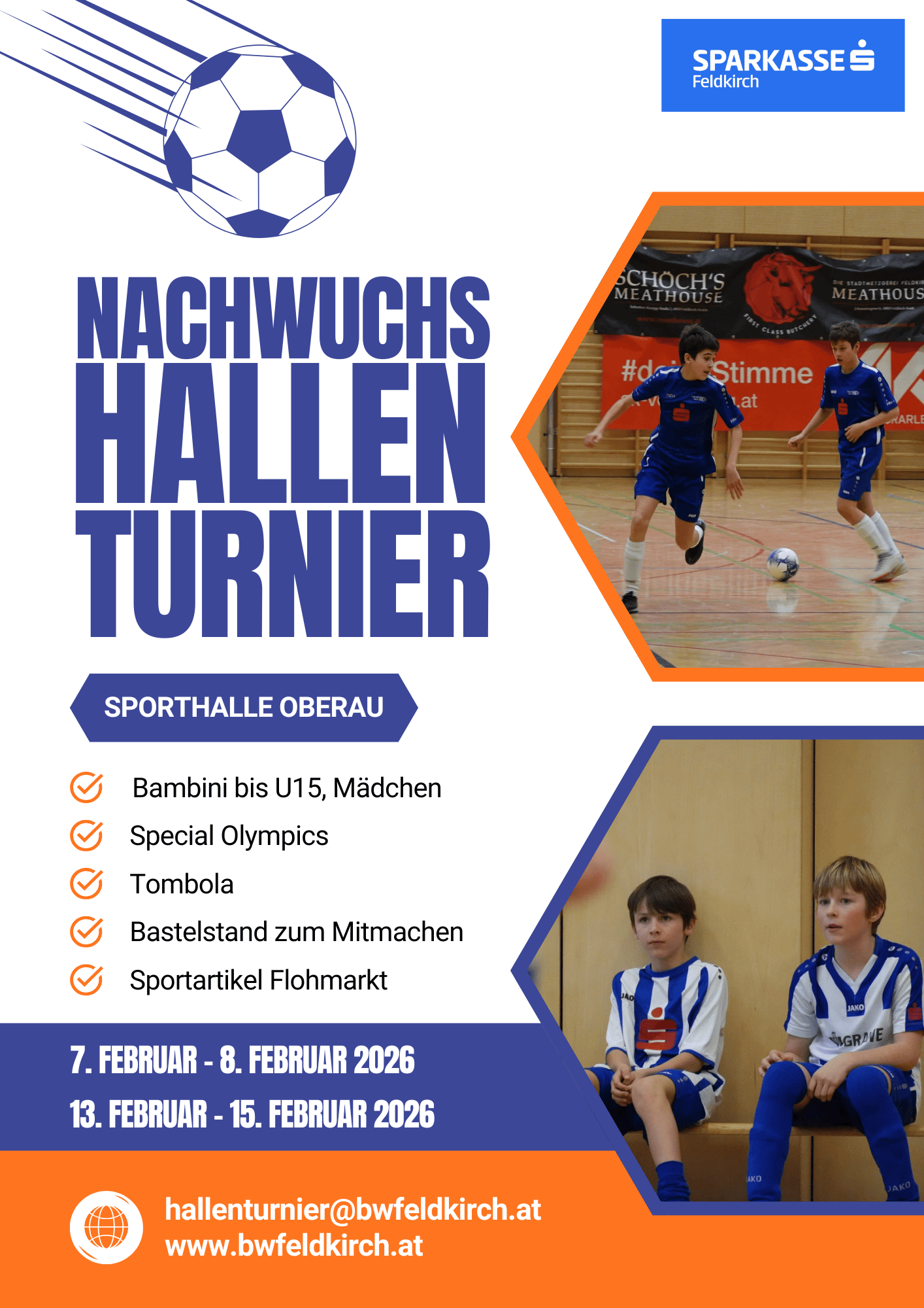 Der Sparkasse FC BW Feldkirch lädt im Februar 2026 herzlich zum Sparkassen Hallenturnier in die Sporthalle Oberau ein. An den Wochenenden 07.02. bis 08.02.2026 sowie 13.02. bis 15.02.2026 steht die Sporthalle ganz im Zeichen des Nachwuchsfußballs.