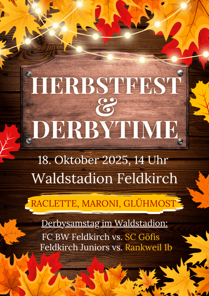 Am Samstag, dem 18. Oktober 2025, lädt der Sparkasse FC BW Feldkirch ab 14 Uhr herzlich zum traditionellen Herbstfest im Waldstadion Feldkirch ein. Die Besucherinnen und Besucher dürfen sich auf einen sportlich spannenden und kulinarisch genussvollen Herbst­­nachmittag freuen.